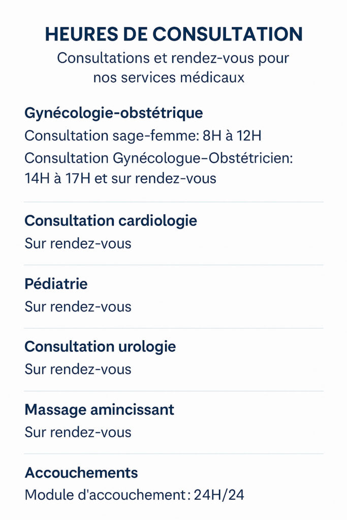 Découvrez notre gamme complète de services médicaux spécialisés, assurés par une équipe expérimentée pour vous accompagner à chaque étape de votre maternité et au-delà.